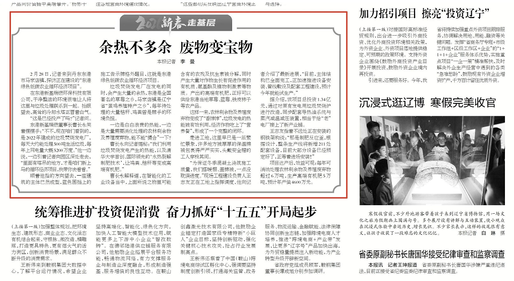 2月28日,《辽宁日报》二版刊发沈阳新基发展有限公司投资建设的“东港绿色低碳农业循环经济项目”。