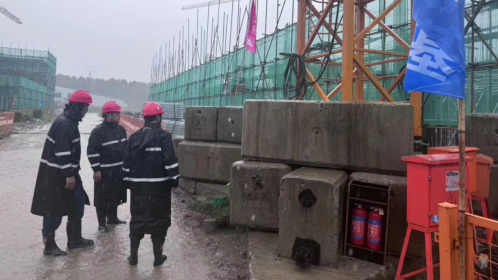 新民垃圾焚烧在建项目及时开展基坑、脚手架、塔吊基础等重要部位隐患排查,雨量增大和大风等极端天气暂停施工并做好临时用电、临边等易出事故点位的防护工作。