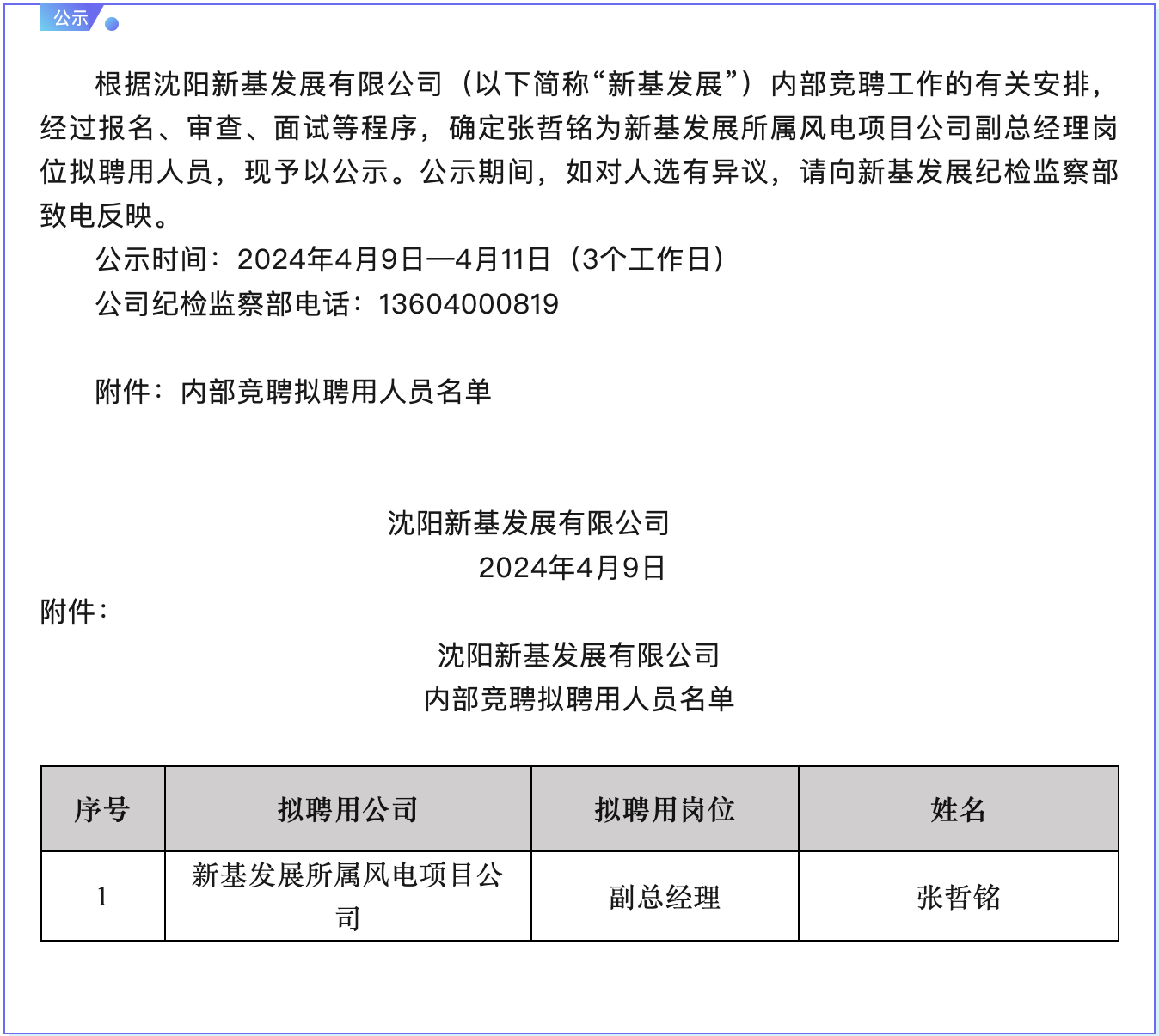 沈阳新基发展有限公司内部竞聘拟聘用人员公示